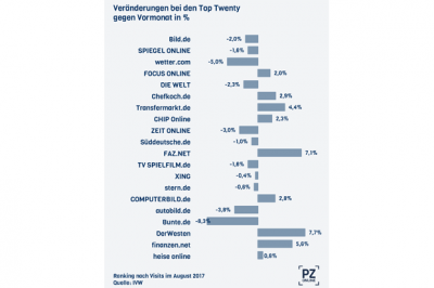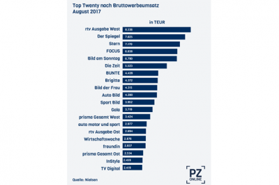 Die bei PZ Online gelisteten Zeitschriften, Wochenzeitungen und Supplements veröffentlichten im Oktober 12.077 Anzeigen- und Beihefterseiten, 746 Seiten weniger als im Oktober des Vorjahres. Der Bruttoumsatz belief sich auf 286 Millionen Euro. Gegenüber dem Vorjahr war dies ein Minus von knapp 13 Millionen Euro oder 4,3 Prozent. Auf die dreißig umsatzstärksten Titel (Grafik unten) entfällt [...]