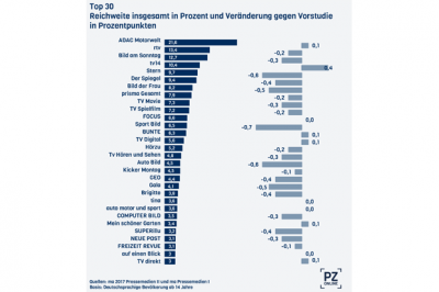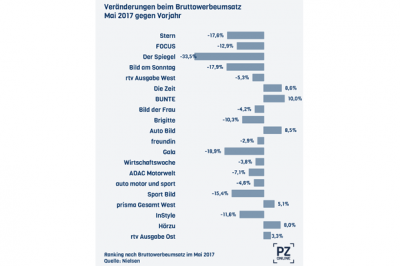 Die IVW-Daten über Visits im Juli 2017 stehen ab sofort bei PZ Online zur Auswertung bereit. Insgesamt 98 Angebote aus den Vermarktungsportfolios der Verlage verbuchen 2,23 Milliarden Visits. Das ist eine Steigerung um 43 Millionen oder 2,0 Prozent gegenüber dem Vormonat, der allerdings auch einen Tag kürzer war. Im Vergleich zum Juli 2016 nehmen die [...]