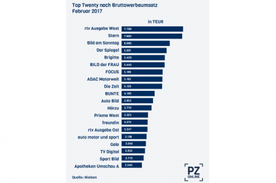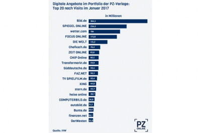 Die Digitalangebote in den Portfolios der PZ-Verlage kommen im Januar 2017 auf eine Bruttoreichweite von 375 Millionen. Gegenüber dem Dezember entspricht dies einem Plus von 18 Millionen oder fünf Prozent. Im Vergleich zum Januar 2016 – damals ging es wegen der „Kölner Silvesternacht“ auf den Nachrichtenseiten hoch her – ist der Zuwachs halb so hoch: [...]