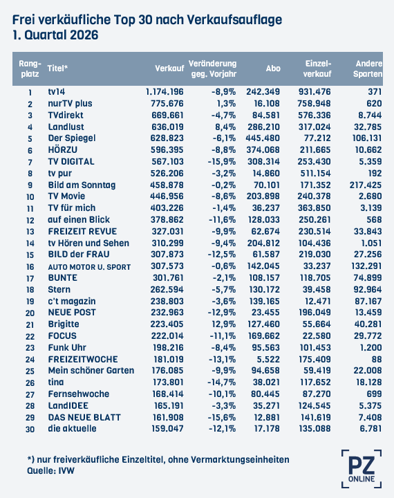 Für die Programmpresse allerdings, das auflagenstärkste Zeitschriftensegment, spielt das ePaper nur eine untergeordnete Rolle. Das Ranking der meistverkauften Titel wird von TV 14 mit rund 1,17 Millionen Exemplaren angeführt, und unter den Top 10 platzieren sich sechs weitere Programmzeitschriften (Tabelle unten). In den meisten Fällen bildet der Einzelverkauf die wichtigste Sparte. Bei zwei der führenden Titel – bei Hörzu und TV digital – liegt das Abo vorn, und hier wird auch ein kleiner Teil digital ausgeliefert.