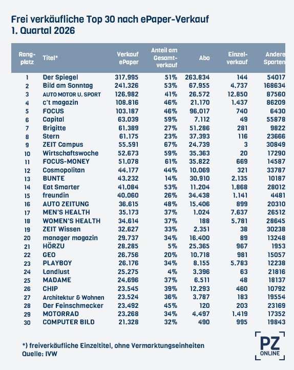Hohen Stellenwert hat das ePaper für viele Wirtschafts- und Finanztitel. Bei Focus-Money steht es für 61 Prozent des Gesamtverkaufs, bei Capital und Wirtschaftswoche für jeweils 59 Prozent. Zurückhaltender ist das Manager Magazin mit einem Anteil von 34 Prozent.
