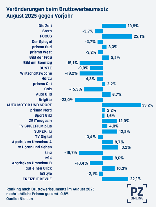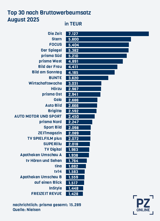 Mit 15,3 Millionen Euro rangiert das TV-Supplement Prisma nach Anzeigenumsatz vor allen frei verkäuflichen Titeln, wenn man seine vier Regionalausgaben zusammenfasst. Die höchsten Beiträge dazu liefern wiederum die Süd- und die Westausgabe.
