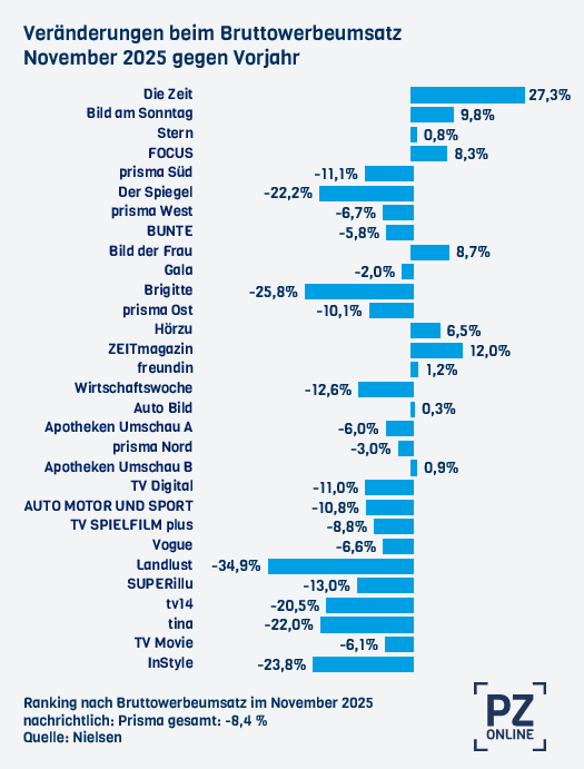 Nach elf Monaten steht fest: Die Zeit wird 2025 zum dritten Mal in Folge der im Werbemarkt umsatzstärkste Titel unter den frei verkäuflichen Zeitschriften und Wochen-/Sonntagszeitungen sein. Mit 86,2 Millionen Euro und einem Plus von rund fünf Prozent liegt die Wochenzeitung uneinholbar an der Spitze (Tabelle unten). Der Stern, früherer Seriensieger in der Jahresbilanz, folgt mit 64,6 Millionen Euro und einem kleinen Plus von knapp zwei Prozent. Der Spiegel kommt auf 60,7 Millionen Euro und verbucht Verluste. Er liegt aber – anders als in der Monatsbilanz – noch klar vor Focus mit 56,4 Millionen Euro.