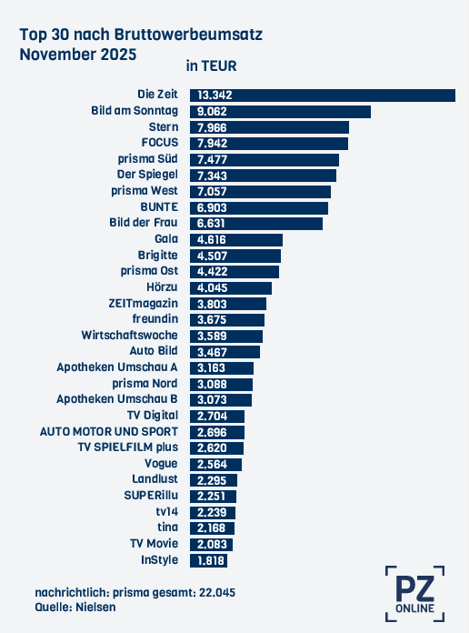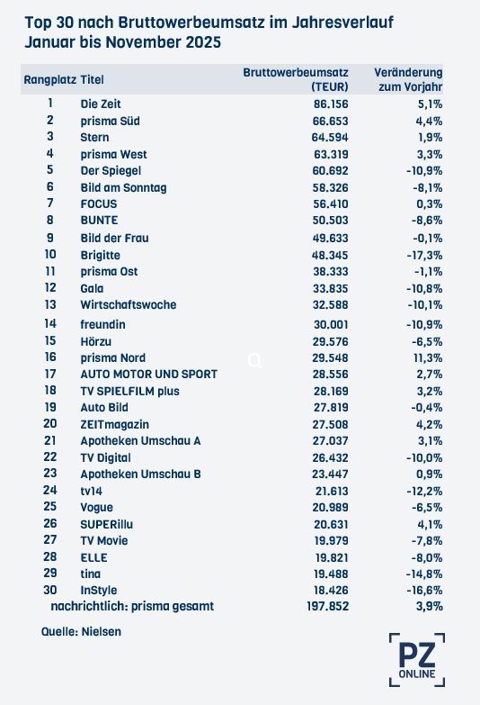 Das TV-Supplement Prisma rangiert wie üblich mit der Süd- und der Westausgabe in der Spitzengruppe, mit der Ost- und der Nordausgabe hingegen im Mittelfeld der Top 30. Zählt man alle vier Regionalausgaben zusammen, so kommt die auflagenstarke TV-Beilage auf einen Bruttowerbeumsatz von 22,0 Millionen Euro. Damit liegt sie weit vor allen frei verkäuflichen Titeln.